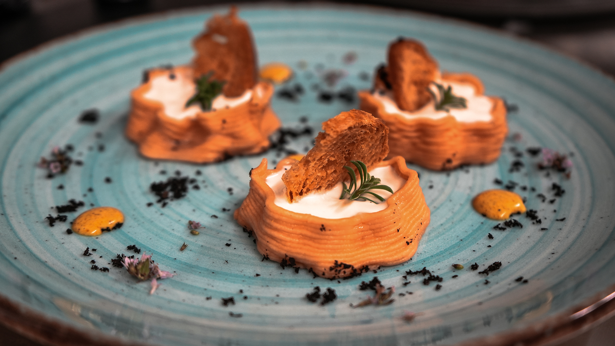 Pasta al pomodoro ottenuta valorizzando le bucce di pomodoro coltivato in idroponica sotto LED a spettro controllato che produce un microstress luminoso non dannoso. Questa tecnica consente di ottenere pomodori con alto contenuto di componenti bio-attivi ideali per la salute umana. Le bucce di pomodoro vengono poi essiccate, polverizzate e mescolate con acqua e farina per ottenere una pasta bioattiva. Questa tecnica non solo valorizza le bucce, ma arricchisce la pasta di antiossidanti mantenendo sapore e consistenza attraverso la stampa 3D.